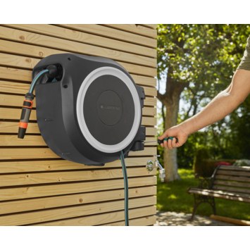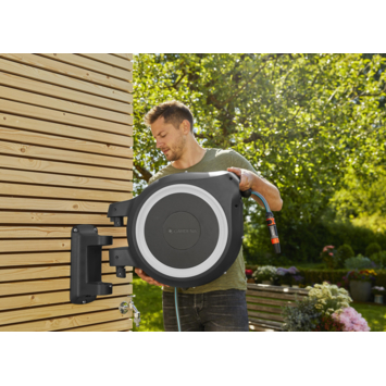 Bewatering die altijd gebruiksklaar is: Met de wandslangenbox RollUp XL is het bewateren van uw tuin een waar genoegen. Deze wandslangenbox bespaart u het moeizame oprollen, uw handen blijven schoon en de slang raakt niet in de knoop. De tuinslang, die aan elke muur kan worden bevestigd, is veilig weggeborgen en zeer ruimtebesparend. Vóór gebruik trekt u de slang van 30 meter uit tot de gewenste lengte. Zodra u stopt, grijpen de extra korte vergrendelingspunten vast en zetten ze de tuinslang vast op de gewenste lengte. Dankzij de handige muurbeugel kan de slangenhouder 180 graden worden gedraaid en uw bewegingen in de tuin ongemerkt volgen. Hierdoor kunt u uw bewateringswerkzaamheden eenvoudig uitvoeren, hebt u maximale bewegingsvrijheid en knikt de slang niet. De slang hoeft niet te worden gebogen of gedraaid als u hem wilt oprollen: lichtjes trekken aan het uiteinde van de slang is voldoende om de vergrendeling los te maken. De hoogwaardige stalen veer in de box rolt de slang automatisch, betrouwbaar en gelijkmatig voor u op. De innovatieve RollControl-technologie zorgt voor veilig en gecontroleerd oprollen. Dankzij de geïntegreerde slanggeleider ontstaan er geen knopen of knikken bij het oprollen van de slang, waardoor schade aan de tuinslang wordt voorkomen. Met de kraan- en slangkoppelingen van het Original GARDENA System kunt u de slang flexibel verlengen of andere GARDENA opzetstukken bevestigen. Uw GARDENA slangopzetstukken zijn altijd klaar voor gebruik. Ze kunnen onder de muurbeugel worden bevestigd en daar worden opgeborgen om ruimte te besparen. Het hoogwaardige materiaal is bestand tegen UV, vorst en andere weersomstandigheden en kan daarom het hele jaar door worden gebruikt. De box is voorzien van diefstalbeveiliging. De slangenbox wordt geleverd met alle vereiste aansluitonderdelen: een muurbeugel, een aansluitslang, alle benodigde Original GARDENA System en montageonderdelen en een mondstuk met twee verschillende sproeiopties. GARDENA geeft vijf jaar garantie op de hoogwaardige slangopslag.