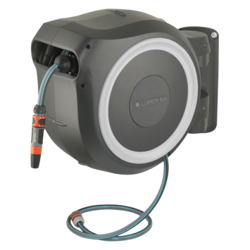 Bewatering die altijd gebruiksklaar is: Met de wandslangenbox RollUp M/L is het bewateren van uw tuin een waar genoegen. Deze wandslangenbox bespaart u het moeizame oprollen, uw handen blijven schoon en de slang raakt niet in de knoop. De tuinslang, die aan elke muur kan worden bevestigd, is veilig weggeborgen en zeer ruimtebesparend. Vóór gebruik trekt u de slang van 25 meter uit tot de gewenste lengte. Zodra u stopt, grijpen de extra korte vergrendelingspunten vast en zetten ze de tuinslang vast op de gewenste lengte. Dankzij de handige muurbeugel kan de slangenhouder 180 graden worden gedraaid en uw bewegingen in de tuin ongemerkt volgen. Hierdoor kunt u uw bewateringswerkzaamheden eenvoudig uitvoeren, hebt u maximale bewegingsvrijheid en knikt de slang niet. De slang hoeft niet te worden gebogen of gedraaid als u hem wilt oprollen: lichtjes trekken aan het uiteinde van de slang is voldoende om de vergrendeling los te maken. De hoogwaardige stalen veer in de box rolt de slang automatisch, betrouwbaar en gelijkmatig voor u op. De innovatieve RollControl-technologie zorgt voor veilig en gecontroleerd oprollen. Dankzij de geïntegreerde slanggeleider ontstaan er geen knopen of knikken bij het oprollen van de slang, waardoor schade aan de tuinslang wordt voorkomen. Met de kraan- en slangkoppelingen van het Original GARDENA System kunt u de slang flexibel verlengen of andere GARDENA opzetstukken bevestigen. Uw GARDENA slangopzetstukken zijn altijd klaar voor gebruik. Ze kunnen onder de muurbeugel worden bevestigd en daar worden opgeborgen om ruimte te besparen. Het hoogwaardige materiaal is bestand tegen UV, vorst en andere weersomstandigheden en kan daarom het hele jaar door worden gebruikt. De box is voorzien van diefstalbeveiliging. De slangenbox wordt geleverd met alle vereiste aansluitonderdelen: een muurbeugel, een aansluitslang, alle benodigde Original GARDENA System en montageonderdelen en een mondstuk met twee verschillende sproeiopties. GARDENA geeft vijf jaar garantie op de hoogwaardige slangopslag.
