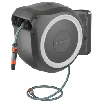 Met de wandslangenbox RollUp XL is het bewateren van een grote tuin aangenaam en eenvoudig. U bevestigt de compacte slangopslag permanent op de muur van uw huis en sluit deze met een aansluitslang aan op de kraan. Dankzij de 35 meter lange slang en de 180 graden draaibare slangenbox is het heerlijk om uw planten te bewateren en is dit geen corvee meer. De slangenhouder volgt uw bewegingsrichting en voorkomt dat de slang gaat knikken of in de war raakt. Nadat u de slang tot de gewenste lengte voor het bewateren hebt uitgetrokken, grijpen de zeer korte vergrendelingspunten zich automatisch vast en blokkeren ze de slang zodra u stopt. Door lichtjes aan het uiteinde van de slang te trekken, wordt het vergrendelmechanisme ontgrendeld en wikkelt een geïntegreerde stalen veer de verlengde tuinslang volledig automatisch, betrouwbaar en gelijkmatig voor u op. Dankzij de innovatieve RollControl-technologie gebeurt het oprollen veilig en gecontroleerd. De geïntegreerde slanggeleider zorgt ervoor dat de slang netjes en gelijkmatig wordt opgerold, zonder dat deze in de knoop raakt. De kraan- en slangaansluitingen van de slangenbox maken deel uit van het Original GARDENA System, zodat u op elk gewenst moment andere GARDENA opzetstukken kunt aansluiten. U hebt altijd uw GARDENA mondstukken bij de hand: ze kunnen onder de muurbeugel worden bevestigd en daar worden opgeborgen om ruimte te besparen. Het hoogwaardige materiaal is UV- en vorstbestendig en bestand tegen weersinvloeden. Daarom kan het systeem het hele jaar door worden gebruikt. Bovendien is de slangopslag beveiligd met een antidiefstalvoorziening. Alle benodigde aansluit- en montageonderdelen worden bijgeleverd in de wandslangenbox RollUp: een muurbeugel, een aansluitslang, alle benodigde Original GARDENA System onderdelen en een mondstuk met twee verschillende sproeiopties. GARDENA geeft vijf jaar garantie op de hoogwaardige slangopslag. Bewatering die altijd gebruiksklaar is , dankzij de GARDENA wandslangenbox RollUp XL.