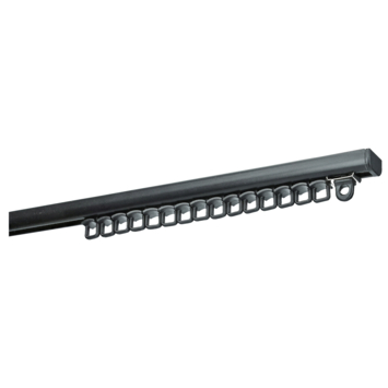 De gordijnrail Subtile zwart 150 cm is een mat zwarte en slank vormgegeven gordijnrail welke uitstekend past in elk interieur. Het unieke van deze rail is vooral de mooie afwerking, het aluminium materiaal is gelakt in een stoere matzwarte finish. Deze gordijnrail is geschikt voor plooigordijnen. Deze rail wordt geleverd met 15 runners, 3 plafondsteunen en 2 eindsteunen. De meegeleverde, rollende runners glijden geruisloos door deze rail. Deze rail bevestig je met de bijgeleverde plafondsteunen aan je plafond d.m.v. onzichtbare montage. Met deze complete set heb je alles in huis om je gordijn makkelijk en snel te installeren.