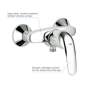 De GROHE douchekraan Swift met hendel Chroom 15 cm is een douchemengkraan met een tijdloos en eenvoudig ontwerp. De douchekraan bestaat uit een chromen douchekraan met hartafstand 15 cm, 2 S-koppelingen, 2 rozetten en een montagehandleiding. Deze mooie, krasbestendige GROHE StarLight® chromen kraan heeft een handige eenhendelbediening, waarmee je eenvoudig met 1 hand de kraan naar de gewenste temperatuur draait. Met de GROHE SilkMove® technologie doe je dat extra gemakkelijk: de grote instelhoek en unieke keramische schijven zorgen ervoor dat je de kraan comfortabel en nauwkeurig kan bedienen. In de kraan zijn keerkleppen geïntegreerd: die zorgen ervoor dat er geen vuil water terug de leiding in stroomt. De waterstroom kun je beperken door bij de installatie de doorstroombegrenzer in te stellen: daarmee bespaar je op je waterverbruik. Het monteren van de kraan doe je eenvoudig zelf met het meegeleverde materiaal en handleiding. De kraan heeft het Belgaqua keurmerk en bij aankoop profiteer je ook nog eens van 5 jaar fabrieksgarantie.