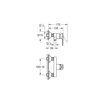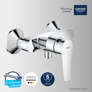 Wandmontage. Metalen greep. GROHE Longlife 35 mm kardoes met keramische schijven. Met geïntegreerde drukafhankelijke temperatuurbegrenzer. Variabel instelbare temperatuurbegrenzer. Douche-aansluiting onder 1/2". Met geïntegreerde terugslagklep. Beveiligd tegen terugstroming. S-koppelingen inbegrepen. Metalen wandrozet inbegrepen