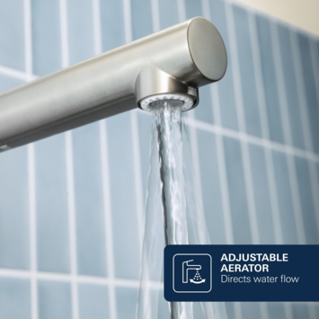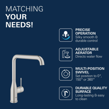 Met de GROHE keukenkraan Essence L-size met hendel Supersteel heb je veel ruimte bij je gootsteen dankzij de hoge uitloop van 30 cm. Dat biedt je veel gemak als je grote pannen wil vullen of afspoelen. Omdat de kraanuitloop ook in drie standen verstelbaar is, 0°, 150° en 360°, biedt de kraan je uitermate veel flexibititeit in gebruik. Met de eenhendelbediening zet je gemakkelijk met 1 hand de kraan aan. Door de GROHE SilkMove keramische schijven stel je vooraf soepel en nauwkeurig de temperatuur en het watervolume in. Bovendien vergen deze keramische schijven weinig onderhoud. De installatie van de kraan doe je simpelweg zelf met het eenvoudige bevestigingssysteem en de meegeleverde flexibele aansluitslagen, bevestigingsmateriaal en montagehandleiding. De kraan is met zijn hoge U-vormige uitloop op een flesvormige basis een aanwinst in je keuken en geeft een ingetogen uitstraling aan je interieur. De geborstelde inox (supersteel) afwerking is krasbestendig en blijft met het juiste onderhoud jarenlang mooi in je keuken. Als je deze kraan koopt, dan profiteer je van 5 jaar fabrieksgarantie. De kraan is ook verkijgbaar in de kleuren Warm Sunset (geborsteld koper), chroom en grafiet, en ook als wastafelkraan. Zo kies je altijd de juiste kraan in de kleur naar jouw smaak!