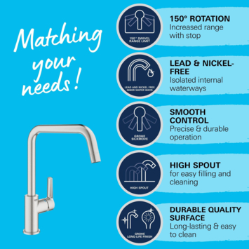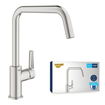 De GROHE Start eengreeps spoelbakkraan met hoge U-uitloop – onze QuickFix bestseller – maakt je keuken weer van deze tijd dankzij de geweldige prestaties en slimme functies in een slank, moderner silhouet. Deze klassieker is aangepast om te voldoen aan de eisen van moderne keukens, met een slank, hedendaags profiel en een 35% hogere uitloop voor meer gebruikerscomfort. Deze keukenkraan is ontworpen voor eengatsinstallatie en de hoge uitloop draait soepel over 150°, wat meer flexibiliteit biedt bij de spoelbak zonder dat je bang hoeft te zijn voor spatten. In de kraan zelf biedt de GROHE SilkMove cartouche technologie voor een soepele en nauwkeurige bediening en GROHE Zero geïsoleerde binnenwateren zorgen ervoor dat je drinkwater lood- en nikkelvrij is. Een instelbare doorstroombegrenzer bespaart water en geld, terwijl een geïntegreerde temperatuurbegrenzer verbranding van heet water helpt voorkomen. De matte, slijtvaste GROHE StarLight-coating maakt gebruik van physical vapour deposition (PVD) voor een tien keer hogere krasbestendigheid dan gewoon chroom. Ontworpen voor eengatsinstallatie en inclusief de QuickGuide en QuickVideo die je vindt door de QR-code te scannen en het gereedschapsloze QuickMount-systeem kan de kraan snel worden gemonteerd. Voor deze kraan wordt een druk van minimaal 1,0 bar aanbevolen.