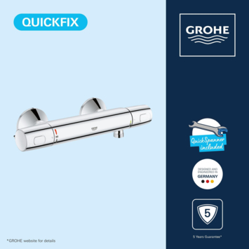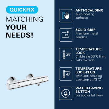 De Grohe Thermostatische Douchekraan Precision Trend New Chroom 15 cm is geschikt voor badkamers waar de hart-op-hart afstand tussen de koud- en warmwaterleiding 150 mm is. Deze thermostatische douchekraan zorgt voor een heerlijke douche met een constante watertemperatuur, ook al zijn er fluctuaties in de waterdruk. De kraan is voorzien van GROHE TurboStat: hiermee wordt snel en continu de gewenste temperatuur bereikt. De kraan beschikt over GROHE CoolTouch®, waardoor het binnenkomende hete water wordt omspoeld door koud water en de buitenkant van de thermostaatkraan nooit warmer wordt dan de temperatuur van het douchewater. Met de SafeStop knop op 38°C voorkom je dat je kinderen de temperatuur verhogen, terwijl je dankzij de volumegreep met GROHE EcoButton tot 50% water kunt besparen. De robuuste ergonomisch gevormde metalen grepen zorgen tevens voor een optimale grip.