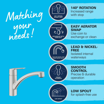 De GROHE Start eengreeps keukenkraan breng je je keuken snel en eenvoudig up-to-date dankzij het nieuwe montagesysteem. Deze designklassieker is opgefrist om te voldoen aan de eisen van moderne keukens en heeft nu een slank, modern profiel en beschikt over meer gebruikscomfort. Deze keukenkraan is ontworpen voor eengatsinstallatie en de lage uitloop kan soepel 150° worden gedraaid, wat meer flexibiliteit biedt aan de spoelbak zonder dat je op de muren spettert. De mousseur kan eenvoudig worden verwisseld met behulp van slechts een muntje – er komt dus geen gereedschap aan te pas. Binnenin zorgt de technologie van het GROHE SilkMove ES-cartouche voor een levenslange soepele en nauwkeurige bediening terwijl GROHE Zero geïsoleerde binnenwaterwegen zorgt ervoor dat je drinkwater lood- en nikkelvrij is. Een instelbare debietbegrenzer bespaart water en geld terwijl een geïntegreerde temperatuurbegrenzer verbranding voorkomt. De matte, slijtvaste GROHE StarLight-coating maakt gebruik van Physical Vapour Deposition (PVD) waardoor het tien keer meer krasbestendigheid heeft dan gewoon chroom. Met de GROHE QuickFix Plus-set kan de keukenkraan eenvoudig en snel worden geïnstalleerd, zonder dat je gereedschap nodig hebt. Voor deze kraan wordt een minimale druk van 1,0 bar aanbevolen.