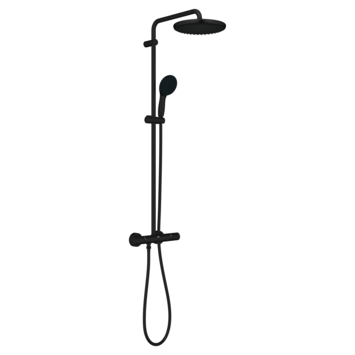 Transformeer je badkamer met het Vitalio Start Systeem 250 met thermostatische mengkraan, een compleet douchesysteem dat stijl, technologie en gebruiksgemak combineert. De mat zwarte afwerking voegt een moderne en luxe uitstraling toe, terwijl de innovatieve functies zorgen voor een douche-ervaring op maat.