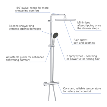 Met de ingebouwde thermostaatkraan heb je altijd controle over de watertemperatuur, wat zorgt voor een constante en veilige douche-ervaring. De anti-kalk functie maakt het onderhoud van de set eenvoudig door kalkaanslag te verminderen, terwijl de waterbesparende technologie helpt om je waterverbruik te verlagen zonder in te boeten op comfort.