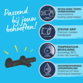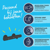 De GROHE Precision Start thermostatische badmengkraan in Matte Black (mat zwart) wordt geleverd met duurzame veiligheidsfuncties en een gebruiksvriendelijke bediening. Uitgevoerd in een slank design is deze wandmengkraan perfect voor het creëren van een minimalistische look. Ontworpen met GROHE TurboStat-technologie geniet je met deze mengkraan vrijwel meteen van de ingestelde watertemperatuur en deze blijft constant. De GROHE SafeStop-knop is ingesteld op 38°C om te voorkomen dat douchegebruikers - vooral kinderen - de watertemperatuur per ongeluk te hoog zetten. De GROHE SafeStop Plus-temperatuurbegrenzer kan worden ingesteld op 43°C voor extra bescherming. De badkraan is voorzien van GROHE Water Saving-technologie waardoor de waterstroom wordt verminderd voor een milieuvriendelijk waterverbruik. Als je een volledige waterstroom nodig hebt, hoef je alleen maar op de EcoButton te drukken. Met de automatische omstelling wissel je eenvoudig tussen de baduitloop en handdouche. Voeg een GROHE handdouche naar keuze toe voor een comfortabele en ontspannen bad-ervaring! De duurzame en onderhoudsvriendelijke GROHE Long-Life Finish zorgt ervoor dat de GROHE Precision Start thermostatische badmengkraan er een leven lang als nieuw uitziet.