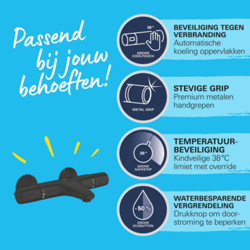 Met Grohe CoolTouch blijft de thermostaat altijd koel aanvoelen, zodat je je nooit kunt verbranden. De Grohe SafeStop veiligheidsknop voorkomt dat de temperatuur hoger wordt dan 38°C, een geruststellende extra voor gezinnen met kinderen. Bij koudwateruitval zorgt de automatische uitschakeling ervoor dat de waterstraal wordt beperkt, zodat je veilig kunt blijven genieten.