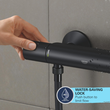 De waterbesparende GROHE Precision Start thermostatische douchemengkraan is fijn om te bedienen en is uitgerust met diverse veiligheidsfuncties. Ideaal voor gezinsbadkamers! De douchekraan is uitgevoerd in Matte Black (mat zwart) en levert binnen enkele seconden de gewenste temperatuur dankzij GROHE TurboStat-technologie. Ook heb je geen last van temperatuurschommelingen tijdens het douchen. Ontworpen met een GROHE Water Saving-functie bespaar je op je waterverbruik met behoud van een luxe douchekwaliteit. Via één druk op de EcoButton kun je deze de waterbesparende functie makkelijk in- en uitschakelen. Ook qua veiligheid is deze douchekraan een aanwinst. Zo is de GROHE SafeStop-knop ingesteld op 38°C om verbranding van de huid door heet water te voorkomen. De GROHE SafeStop Plus-temperatuurbegrenzer kun je instellen op 43°C voor extra veiligheid. De GROHE Precision Start thermostatische douchemengkraan heeft een krasvaste GROHE Long-Life Finish waardoor de mat zwarte afwerking onberispelijk blijft.