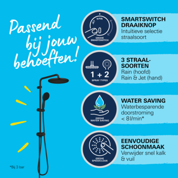Met het Grohe Vitalio Start 250 Flex douchesysteem geniet je elke dag van een super-luxe douche-ervaring. Het douchesysteem wordt geleverd met een Vitalio Start 250 hoofddouche, een Vitalio Start 100 handdouche, een inverter om eenvoudig over te schakelen van de hoofddouche naar de handdouche, een douchestang met een 390 mm douchearm en een schuifelement om de handdouche te verstellen, evenals een Vitalioflex Trend doucheslang. De hoofddouche biedt twee prachtige soorten straalstralen: de ontspannende regenstraal en de waterbesparende SmartRain Spray die wordt geactiveerd door een simpele draai aan de omleiding. En als je stopt met douchen, minimaliseert de Grohe DropStop-technologie het druppelen voor optimaal comfort in je badkamer. De 100 mm handdouche is voorzien van een ShockProof siliconen ring en zorgt voor een zachte regenstraal. Beide douchekoppen zijn voorzien van de Grohe Water Saving-functie, die water bespaart en de maandelijkse kosten verlaagt. Deze opvallende handdouche is verkrijgbaar in Mat Zwart en deze matte afwerking blijft krasbestendig dankzij de Grohe Long-Life Finish. Ook kalkaanslag maakt geen schijn van kans, want eventuele kalkresten kunnen met slechts één vinger uit de SpeedClean antikalkspuitgaten worden geschrobd. Het Grohe Vitalio Start 250 Flex douchesysteem kan worden gecombineerd met uw huidige douchekraan dankzij de flexibele installatie en eenvoudige aansluiting. Het updaten van uw doucheruimte was nog nooit zo eenvoudig!