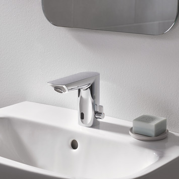 Handen wassen en tanden poetsen was nog nooit zo makkelijk met de GROHE wastafelkraan Bau Cosmopolitan met infrarood sensor Chroom. Met de vooruitstrevende technologie van GROHE gebruik je water efficiënter dan ooit. De infraroodsensor detecteert namelijk bewegingen van je hand, zodat het water alleen stroomt wanneer dat nodig is. Bovendien beperkt de ingebouwde GROHE EcoJoy de waterstroom tot maximaal 5,7 l/min zonder dat je op comfort inlevert. Met de sensor en de EcoJoy bespaar je op je waterverbruik en het geeft je een luxe gevoel. De 13 cm hoge kraan heeft een instelbare temperatuurbegrenzer: met de hendel aan de zijkant van de kraan stel je vooraf gemakkelijk de gewenste temperatuur in. Dat is niet alleen veilig, je bespaart ook op je energierekening. Doordat je met de sensor de kraan bedient, is contact met je huid minimaal: dat maakt deze kraan een hygiënische oplossing in je badkamer. De kraan is hierbij voorgeprogrammeerd op basis van de meest gebruikte voorkeuren. Als je meer instellingen wilt activeren, zoals automatische hygiënespoeling en thermische desinfectie, kun je de GROHE afstandsbediening erbij kopen. De kraan reinig je zelf snel en eenvoudig: de waterstroom blokkeer je hierbij door met je duim de onderkant van de sensor af te dekken. Dankzij de GROHE StarLight chromen afwerking blijft de kraan jarenlang stralen. Ook de batterijen van de sensor gaan tot wel 7 jaar mee, zelfs als je de kraan 150 keer per dag gebruikt. Dat komt omdat de contactloze technologie weinig energie nodig heeft. Installeren van de kraan doe je eenvoudig zelf met de meegeleverde aansluitslang, sensor, batterij en bevestigingsmateriaal. Als je deze kraan koopt, dan profiteer je bovendien van 5 jaar fabrieksgarantie. Met deze kraan kies je niet alleen voor strakke lijnen, verfijnde vormgeving en een moderne uitstraling: het is vooral een luxe, hygiënische, water- en energiebesparende wastafelkraan voor je badkamer! Van dit model is ook een fonteinkraan verkijgbaar.