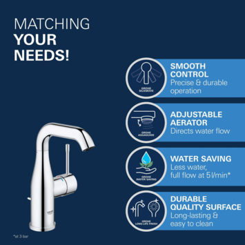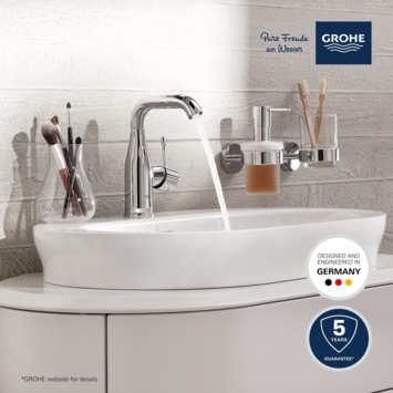 Met de GROHE wastafelkraan Essence M-size met hendel en waste Chroom heb je veel ruimte bij je wastafel door de medium hoge uitloop van 19,3 cm. Ook de 360° draaibare uitloop geeft je extra ruimte, comfort en flexibiliteit. Met de eenhendelbediening zet je gemakkelijk met 1 hand de kraan aan. Dankzij de GROHE SilkMove keramische schijven stel je vooraf soepel en nauwkeurig de temperatuur in. Ook kun je daarmee nauwkeurig het watervolume regelen. Bovendien vergen deze keramische schijven weinig onderhoud. Dankzij de ingebouwde GROHE EcoJoy Technologie bespaar je flink op je waterverbruik: zelfs met een volle waterstraal verbruik je slechts maximaal 5,7 l/min! De AquaGuide mousseur is draaibaar en zo voorkom je gespetter over je wastafel heen. Met de hendel van de trekwaste aan de achterzijde van de kraan zet je eenvoudig het afvoer open of dicht: je hoeft dus niet meer met je handen in te heet of vies water om het afvoer open te zetten. De installatie van de kraan doe je eenvoudig zelf met het vereenvoudigde GROHE QuickFix snelbevestigingssysteem en de meegeleverde flexibele aansluitslagen, waste en wasteinrichting, afvoerplug, bevestigingsmateriaal en montagehandleiding. De kraan geeft met zijn U-vormige uitloop op een flesvormige basis een ingetogen, retro uitstraling aan je interieur. De GROHE StarLight chromen afwerking is bestendig en blijft met het juiste onderhoud jaren glanzend mooi in je badkamer. Als je deze kraan koopt, dan profiteer je van 5 jaar fabrieksgarantie. De kraan is ook verkijgbaar in de kleuren supersteel (inox), Cool Sunrise (geborsteld messing), Nickel (geborsteld nikkel), Warm Sunset (geborsteld koper) en Hard Graphite (geborsteld grafiet). Zo kies je altijd de juiste kleur naar jouw smaak!