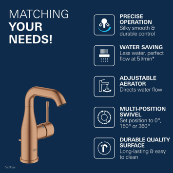 Met de GROHE wastafelkraan Essence M-size met hendel en waste Warm Sunset heb je veel ruimte bij je wastafel door de medium hoge uitloop van 19,3 cm. Ook de 360° draaibare uitloop geeft je extra ruimte, comfort en flexibiliteit. Met de eenhendelbediening zet je gemakkelijk met 1 hand de kraan aan. Dankzij de GROHE SilkMove keramische schijven stel je vooraf soepel en nauwkeurig de temperatuur in. Ook kun je daarmee nauwkeurig het watervolume regelen. Bovendien vergen deze keramische schijven weinig onderhoud. Dankzij de ingebouwde GROHE EcoJoy Technologie bespaar je flink op je waterverbruik: zelfs met een volle waterstraal verbruik je slechts maximaal 5,7 l/min! De AquaGuide perlator is draaibaar: zo voorkom je gespetter over je wastafel heen. Met de hendel van de trekwaste aan de achterzijde van de kraan zet je eenvoudig het afvoer open of dicht: je hoeft dus niet meer met je handen in te heet of vies water om het afvoer open te zetten. De installatie van de kraan doe je eenvoudig zelf met het vereenvoudigde GROHE QuickFix snelbevestigingssysteem en de meegeleverde flexibele aansluitslagen, waste en wasteinrichting, afvoerplug, bevestigingsmateriaal en montagehandleiding. De kraan geeft met zijn U-vormige uitloop op een flesvormige basis een robuuste uitstraling aan je interieur. De afwerking in het roodgoudkleurige, geborstelde koper is een blikvanger en blijft met het juiste onderhoud jarenlang mooi in je badkamer. Als je deze kraan koopt, dan profiteer je van 5 jaar fabrieksgarantie. De kraan is ook verkijgbaar in de kleuren Chroom, Supersteel (inox), Cool Sunrise (geelgoud geborsteld messing), Nickel (geborsteld nikkel) en Hard Graphite (geborsteld grafiet). Zo kies je altijd de juiste kleur naar jouw smaak!