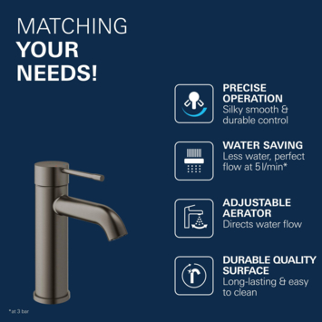 Net als alle Grohe producten zit ook deze Grohe Wastafelkraan Essence New S Grafiet boordevol met Duitse technologie. Met de Grohe SilkMove keramische schijven heb je een precieze controle over de waterstroom. De Grohe EcoJoy functie zorgt ervoor dat de kraan zeer zuinig met water omgaat. Het waterverbruik bevat dan tot 5,7 L per minuut. Het draaibereik van de kraan is zelf in te stellen. Zo kun je hem vast zetten op 0, 150 of 360 graden. Het QuickFix Plussysteem maakt deze wastafelkraan eenvoudig te installeren en halveert zelfs de tijd die je ervoor nodig hebt. De kraan past perfect in combinatie met overige artikelen uit de Grohe Essence New serie. Mocht grafiet niet jouw favoriete kleur zijn of past het simpelweg totaal niet binnen je huidig badkamerstijl. Geen probleem! Je kunt deze wastafelkraan ook in koper of RVS kopen. Daarnaast is deze kraan ook in andere maten verkrijgbaar.