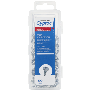 Gebruik deze teksschroeven voor het onderling bevestigen van Metal Stud- of Plagyp-profielen. De zelfborende schroeven hebben een platte kop en zijn gemaakt uit thermisch verzinkt staal.