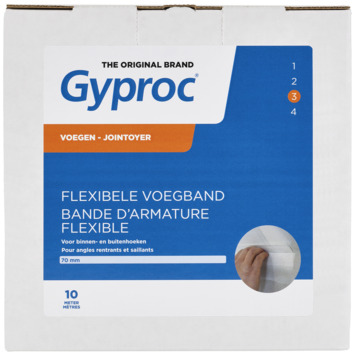 Kies de voegband die bij je Gyproc-klus past. Deze flexibele voegband (10 m) is een voorgeplooide voegband om binnen- en buitenhoeken van Gyproc- platen af te werken. De stootbestendige band is gemaakt uit papier en verstevigd met kunststof.