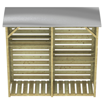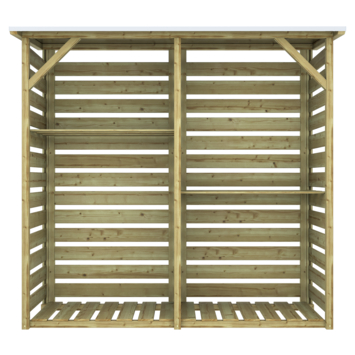 De berging is uitgerust met twee planken die je flexibel kunt monteren aan één of beide zijden van het tussenschot, afhankelijk van je opbergruimtebehoefte. Het platte dak met zinken dakbedekking zorgt ervoor dat het hout altijd droog blijft, zelfs bij regen. Daarnaast zorgt de vloer ervoor dat het hout van de grond ligt, wat bijdraagt aan betere ventilatie en voorkomt dat het hout vochtig wordt.