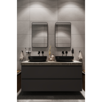 Deze rechthoekige badkamerspiegel van Haceka uit de Deco-serie heeft afgeronde hoeken en een mat zwart aluminium frame. Het formaat van 80 bij 50 cm maakt hem geschikt voor grotere badkamers of ruimtes waar je een opvallendere spiegel wilt. Door het lichte aluminium hang je hem gemakkelijk zelf op. De afgeronde hoeken verzachten het strakke ontwerp en zorgen voor een eigentijdse look zonder te zwaar te lijken. De spiegel is 3 cm diep en daardoor makkelijk schoon te houden met een glasreiniger of mild schoonmaakmiddel. Montagemateriaal is niet inbegrepen.