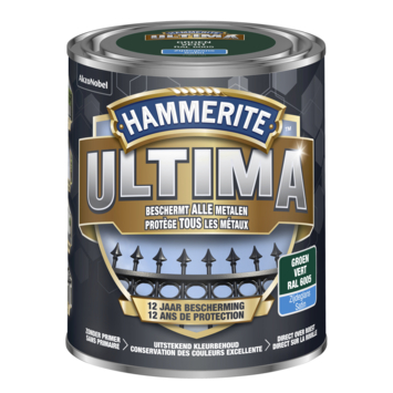 De Hammerite ultima zijdeglans groen 750 ml van Hammerite biedt een sterke bescherming tegen slijtage, vlekken en weersinvloeden. De lak is geschikt om aan te brengen op metaal. Het product biedt daarbij bescherming aan het oppervlak voor 12 jaar. Het product wordt geleverd in een blik en heeft een inhoudsmaat van 0.75 liter. De inhoud is voldoende voor een rendement van 6 m².