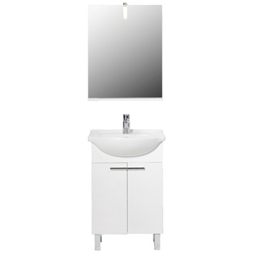 Het Amy badkamermeubel bestaat uit een staand kastje met 2 deuren, een wastafel en een rechthoekige spiegel met verlichting. De kast is gemaakt uit mdf in de kleur wit met hoogglans en de wastafel uit witte keramiek. Inclusief bevestigingsmateriaal, exclusief kraan.