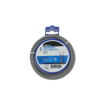 Dit decosnoer heeft een gekleurde en gevlochten mantel van textiel die het snoer een decoratief karakter geeft. Het snoer is geschikt voor het aansluiten van verlichting en licht huishoudelijke apparaten tot maximaal 1380 watt. Het snoer heeft 2 aders (2x0,75) en is 5m lang. Dit type snoer wordt ook wel strijkijzersnoer genoemd, maar technisch is het niet geschikt voor het aansluiten van een strijkijzer. Kleur: zwart-wit.