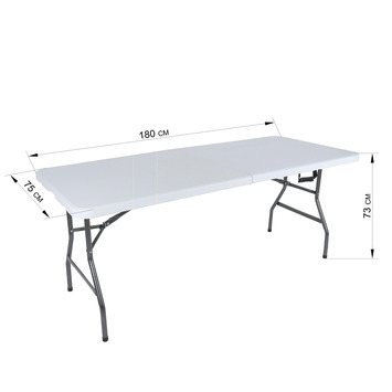 Met een lengte van 180 cm en een breedte van 75 cm biedt de tafel genoeg ruimte voor een gezellig samenzijn, zonder te veel ruimte in te nemen. Het kunststof blad is stevig en gemakkelijk schoon te maken, terwijl het grijze metalen inklapbare onderstel het mogelijk maakt de tafel compact op te bergen wanneer deze niet in gebruik is. De hoogte van 73 cm zorgt ervoor dat de tafel comfortabel is om aan te zitten.