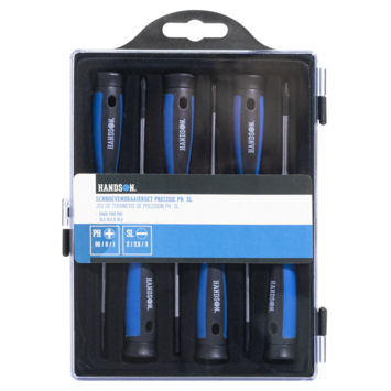 De 6-delige Handson precisieschroevendraaierset PH-SL bestaat uit 6 schroevendraaiers, gemaakt van chroom-molybdeenstaal. De 6 schroevendraaiers zijn geschikt voor Phillips-kruiskopschroeven met maten PH00, PH0 en PH1 en voor sleufkopschroeven met maten SL2, SL2,5 en SL3. Dit zijn schroeven met afmetingen van 3mm en kleiner. De 6-delige set met schroevendraaiers is dankzij de afmetingen van de PH- en SL-schroevendraaiers ideaal voor precisiewerk, zoals het schroeven van schroeven met kleine maten. Bovendien zijn de precisieschroevendraaiers voorzien van een draaiende kop die het schroeven makkelijker maakt. Bekijk GAMMA's assortiment wanneer je op zoek bent naar andere schroevendraaiersets voor precisiewerk.