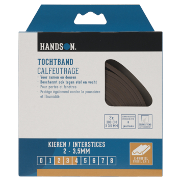 Met de Handson tochtband dicht je kieren en spleten bij ramen en deuren erg effectief. Deze bruine tochtband heeft een E-profiel en is hierdoor geschikt voor het afdichten van kleine kieren van 2 mm tot maximaal 3,5 mm. Zo hou je kou, stof en vocht effectief buiten de deur. Deze tochtband is gemaakt van EPDM-rubber en gaat hierdoor erg lang mee. Dankzij de zelfklevende plaklaag kan de tochtband gemakkelijk worden vastgeplakt in deur- of raamkozijn. In deze verpakking zitten 2 stuks van 3 meter lang.