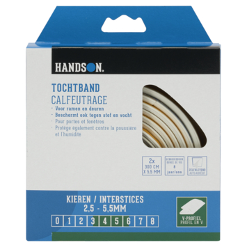 Met de Handson tochtband dicht je kieren en spleten bij ramen en deuren erg effectief. De witte tochtband heeft een V-profiel en is hierdoor geschikt voor het afdichten van kleine kieren van 2,5 mm tot maximaal 5,5 mm. Zo hou je kou, stof en vocht effectief buiten de deur. Deze tochtband is gemaakt van EPDM-rubber en gaat hierdoor erg lang mee. Dankzij de zelfklevende plaklaag kan het tochtband gemakkelijk worden vastgeplakt in deur- of raamkozijn. In deze verpakking zitten 2 stuks van 3 meter lang.