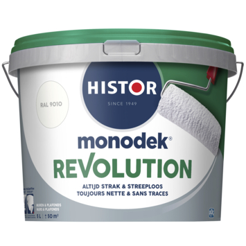 Histor Monodek Revolution RAL9010 5 liter is een revolutie in muurverf. Door de Intelligent Flow Technology; vloeien de lagen naadloos in het elkaar over. Dit zorgt voor een strak en streeploos resultaat!