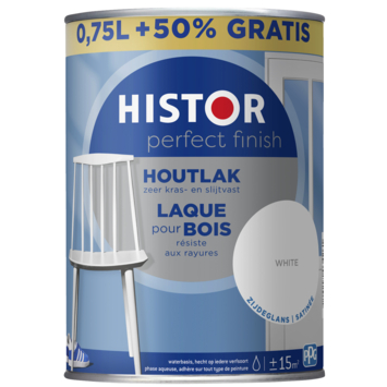 Histor Perfect Finish houtlak is geschikt voor het aflakken van hout, metaal en kunststof. De lak is zeer kras- en slijtvast en extra dekkend. De lak is op waterbasis en kan worden gebruikt over elke vorige verfsoort heen, dus ook over terpentineverf. De verf is makkelijk aan te brengen en sneldrogend. Na 1 uur is de verf stofdroog en na 5 uur overschilderbaar. Verf op terpentinebasis in lichte kleuren kan bij weinig daglicht vergelen. Histor Perfect Finish is een watergedragen houtlak en vergeelt daarom niet en behoudt zijn kleur. Daarnaast is de verf geurloos.