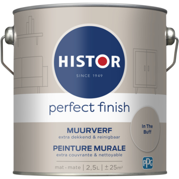 Histor Perfect Finish muurverf In the Buff is een extra dekkende muurverf, ideaal voor alle muren in uw huis. Eenmaal aangebracht bent u verzekerd van een matte uitstraling die langdurig mooi blijft. Naast de standaard beschikbare kleuren is deze verf in meer dan 30.000 verschillende kleuren te verkrijgen in het kleuratelier in onze GAMMA bouwmarkten. Voor het beste resultaat kunt u het beste vooraf een dekkende primer gebruiken. Zorg voor stijlvolle, matte muren in huis met Histor Perfect finish muurverf mat. De inhoudsmaat is 2,5 liter.