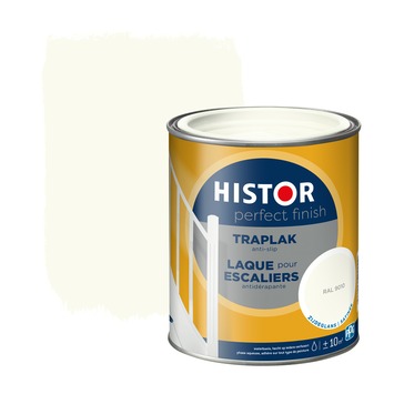 Histor Perfect Finish traplak RAL 9010 zijdeglans 750 ml 750 ml is speciaal ontwikkeld voor het schilderen van houten trappen binnenshuis. De lak is anti-slip en voelt een beetje stroef aan: hierdoor voorkom je uitglijden. De lak is zeer kras- en slijtvast, extra dekkend en geurloos. De lak is op waterbasis en kan worden gebruikt over elke vorige verfsoort heen, dus ook over terpentineverf. Voor het beste resultaat raden wij eerst het gebruik van grondverf aan. De verf is makkelijk aan te brengen en je trap is snel weer beloopbaar. Na 1 uur is de verf stofdroog en na 5 uur overschilderbaar. Naast de kant-en-klare kleuren is deze verf in iedere gewenste kleur te mengen bij de verfmengbalie in de GAMMA winkel. Een blik van 750 ml is voldoende voor ongeveer 10m2.