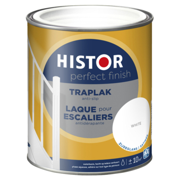 Histor Perfect Finish traplak 7000 wit zijdeglans 750 ml is speciaal ontwikkeld voor het schilderen van houten trappen binnenshuis. De lak is anti-slip en voelt een beetje stroef aan: hierdoor voorkom je uitglijden. De lak is zeer kras- en slijtvast, extra dekkend en geurloos. De lak is op waterbasis en kan worden gebruikt over elke vorige verfsoort heen, dus ook over terpentineverf. Voor het beste resultaat raden wij eerst het gebruik van grondverf aan. De verf is makkelijk aan te brengen en je trap is snel weer beloopbaar. Na 1 uur is de verf stofdroog en na 5 uur overschilderbaar. Naast de kant-en-klare kleuren is deze verf in iedere gewenste kleur te mengen bij de verfmengbalie in de GAMMA winkel. Een blik van 750 ml is voldoende voor ongeveer 10m2.
