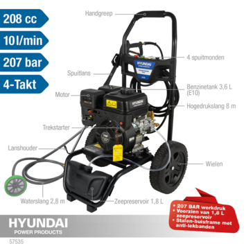 Hogedrukreiniger benzine 207bar 3000PSi 208cc 7,0HP Het Hyundai model 57535 is een hogedrukreiniger, aangedreven door een 7 pk, 4-takt Hyundai-motor, die een continue druk van 180 bar en een debiet van 7,9 l / min levert, waarmee uitdagende reinigingsopdrachten kunnen worden aangepakt en fantastische resultaten worden behaald, Rijden op benzine biedt de vrijheid om te reinigen van elektrische benodigdheden en is dankzij de 12" pneumatische wielen erg wendbaar, Voor alles tot een grootschalig, middelzwaar huishoudelijk gebruik, zal deze machine u niet teleurstellen, Hij wordt geleverd met een 4-delige spuitmondset met een maximale capaciteit van 3000 psi - in staat om de schoontijd met 25% te verminderen, Deze hogedrukreiniger is uitgerust met een hoogwaardige pomp, ontworpen om het hoofd te bieden aan de ontberingen van veeleisende schoonmaakwerkzaamheden waaraan veel standaardpompen niet konden voldoen.