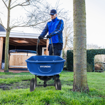 Deze all-season Hyundai strooiwagen is geschikt voor het gelijkmatig verspreiden van zaadgoed, mest, zand, zout, gruis en houtsnippers, De strooihoeveelheid van de strooiwagen is in tien standen instelbaar en de geïntegreerde strooischijf welke mechanisch middels de aandrijfas wordt aangedreven, zorgt voor een constante afgifte van de strooihoeveelheid, Met de bedieningshendel kan je de de strooihoeveelheid instellen en ook afsluiten, De strooiwagen heeft een robuuste stalen constructie en is voorzien van een eenvoudig te reinigen 25 L kunststof bak en rijdt soepel op de brede en 20 cm hoge luchtbanden.