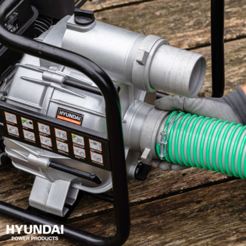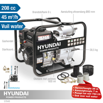 Deze duurzame Hyundai waterpomp heeft een indrukwekkende pompcapaciteit van 750 L per minuut, dankzij de 80 mm (3") in- en uitlaat en krachtige 208 cc OHV-benzinemotor. De pomp is geschikt voor het verpompen van ongeraffineerd en vuil water, waarbij de machine zelfs deeltjes tot 22 mm kan verwerken. Het is belangrijk om op te merken dat deze pomp niet geschikt is voor het verpompen van zeewater of chemische stoffen, omdat dat de interne onderdelen kan beschadigen. De pomp heeft een aanzuighoogte van 7 m en kan het water tot een hoogte van 25 m pompen. Ondanks de krachtige prestaties weegt deze waterpomp slechts 38,5 kg en is hij ontworpen met transport en opslag in gedachten. Het open frame beschermt de pomp tegen schokken en stoten, en fungeert ook als handige handvatten.