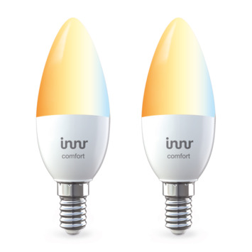 De Innr smart Led lamp heeft een lange levensduur en is energiezuinig in tegenstelling tot halogeenlampen, spaarlampen en gloeilampen. Je bespaart op je verlichtingskosten, doordat je minder energie verbruikt. De verlichtingsbron heeft een lichtopbrengst van 470 lumen en een kleurtemperatuur van 2200 kelvin tot maximaal 5000 kelvin. De lichtkleur kun jij zelf instellen door middel van de Smarthome applicatie. De applicatie is te bedienen met je telefoon, tablet of afstandsbediening. In de verpakking zitten 2 Innr Led lampen. Met 2 lampen creëer jij de gewenste sfeer in huis! De lichtbron heeft een E14 fitting en past in armaturen met een kleine fitting. De lamp heeft een wattage van 5.8 Watt en valt onder energieklasse A+. Dit is één van de meest zuinige energieklasses.