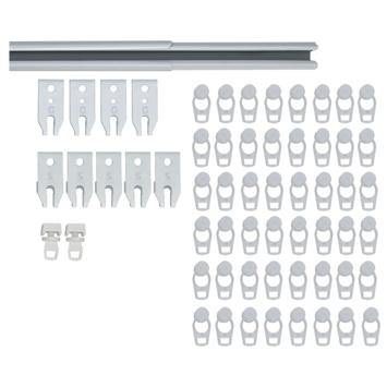 De Intensions complete set uitschuifbare gordijnrail Plus wit 210-400 cm is een mooie en goede basisrail welke gemaakt is van metaal. De rail is slank vormgegeven en is uitgevoerd in de kleur wit. Het handige van deze rail is dat die uitschuifbaar is. De rail heeft dus geen vaste lengte maar past altijd tussen de 210 cm tot 400 cm. Op deze manier hoef je de gordijnrails niet op maat te zagen. Let er wel op dat de gordijnen wat stroever kunnen glijden bij het stuk waar je de rail kunt uitschuiven. Het gebruik van een trekstang wordt aangeraden. De uitschuifbare Plus rail wordt helemaal compleet geleverd inclusief 9 montagesteunen geschikt voor plafondmontage, 48 runners om de gordijnen aan op te hangen en 2 eindstoppers om de rail af te sluiten. De rail is geschikt om alle type plooigordijnen aan op te hangen. Bij deze rail kunnen diverse accessoires gekocht worden, zoals montagesteunen voor montage aan de wand, 2 soorten bochten en diverse onderdelen.