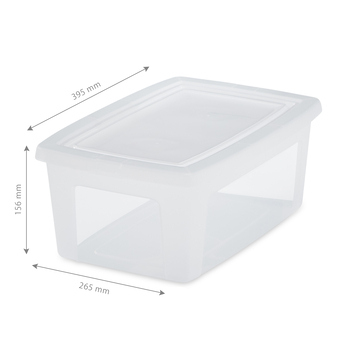 Iris Basic Clear Box is een set van 3 trendy transparante opbergdozen met een inhoud van 11 liter per box. Handig om diverse items te bewaren en stabiel op of in elkaar te stapelen. Toch een andere maat nodig? We bieden deze nestbare box van 397 mm lang, 265 mm breed en 215 mm hoog ook aan met een inhoudsvermogen van 5 of 30 liter. Goed om te weten: de IRIS Modular Clear Box wordt geleverd inclusief deksels.