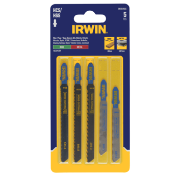 IRWIN decoupeerzaagset IW1014501 is een 5-delige set met een mix van hout-/ en metaalzagen. Bevat 3 houtzagen en 2 metaalzagen met diverse vertandingen voor een fijne tot grove afwerking. De decoupeerzaagbladen hebben een T-aansluiting. De zaagbladen passen ook op de nieuwste generatie decoupeerzagen die een universele aansluiting hebben.