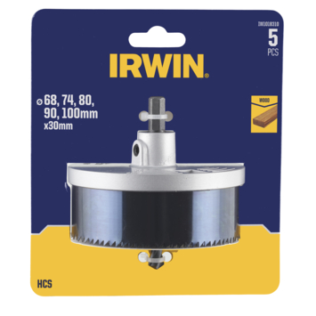 Irwin gatenzaag voor hout en gipsplaat. Ø68/74/80/90/100 mm. 30 mm diep. 5-delig.