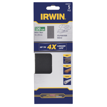 Irwin 1/3vel schuurgaas IW8084014 is geschikt voor alle vlakschuurmachines met schuurzoolafmeting 189x91mm en klembevestiging. Het schuurgaas heeft korrelgrootte 120. Dit zorgt voor een medium afwerking. Afmeting schuurstrook: 230x93mm. Inhoud: 5 stuks. Gewoon schuurpapier verstopt snel waardoor de schuurprestatie afneemt en je tijdens je klus regelmatig het schuurpapier moet vervangen. Piranha schuurGAAS gaat 4x langer mee dan gewoon schuurpapier. Door de open structuur blijft de stofafzuiging optimaal en loopt het schuurgaas niet zo snel vol. Piranha schuurgaas is herbruikbaar doordat je het kunt schoonkloppen en afspoelen. Een ander voordeel van de open structuur is dat schuurgaas op elk merk/type schuurmachine past. Je hoeft namelijk geen rekening te houden met het gatenpatroon in de schuurzool van je schuurmachine.