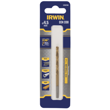 IRWIN HSS Titanium boor 10502585 is een metaalboor met de volgende afmetingen: Ø 4.5mm / werklengte 47mm / totale lengte 80mm. Inhoud: 1 stuk. HSS TITANIUM metaalboren van IRWIN zijn geschikt voor het boren in hard staal en hard gelegeerd staal. De speciaal ontworpen 135° boorpunt zorgt voor een perfecte centreerkwaliteit en vereist minder inspanning/invoerdruk. Het boorlichaam van hoogwaardig HSS staal met Titaniumnitridecoating (TiN) maakt de boor beter hitte- en wrijvingsbestendig, waardoor deze een levensduur heeft die 4x langer is dan van vergelijkbare standaardboren. Ook zeer geschikt voor het boren van allerlei non-ferromaterialen, kunststof, pvc en hout. Voldoen aan kwaliteitsnorm DIN 338. Geschikt voor alle gangbare gesnoerde boormachines en accuboormachines.
