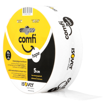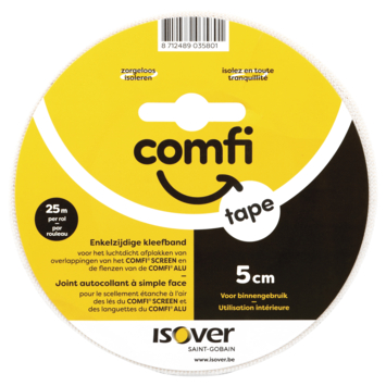 Comfi® TAPE is een eenzijdige kleefband. Comfi® TAPE verzekert een optimale luchtdichtheid van de naad tussen de verschillende lucht/dampschermbanen van het type Comfi® SCREEN. De kleefband kan ook worden gebruikt om de overlappingen van de flenzen van Comfi® ALU luchtdicht af te kleven.