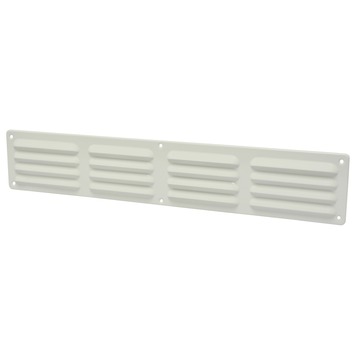Dit witte aluminium IVC Air-schoepenrooster Brut heeft een afmeting van 49,5cm bij 9cm. Met het smalle rooster dek je ventilatiekanalen af. Jij monteert het schoepenrooster eenvoudig op buitenmuren, deuren of kozijnen. Het aluminium schoepenrooster zorgt dan voor natuurlijke ventilatie, maar kan ook een toevoer- of afvoerrooster van mechanische ventilatie zijn. Dan sluit je het aluminium schoepenrooster aan op het ventilatiekanaal. Door de vorm van het schoepenrooster Brut kan regen niet inslaan en wordt het ventilatiekanaal niet nat. Dankzij de witte kleur past dit schoepenrooster van aluminium mooi op een witte buitenmuur. Bovendien is het sterke aluminium rooster duurzaam en onderhoudsvrij. Eventueel kan je het langwerpige schoepenrooster van 49,5cm lang en 9cm hoog voorzien van vliegengaas om ook insecten te weren uit het ventilatiekanaal. De ventilatie van jouw woning blijft dan optimaal.