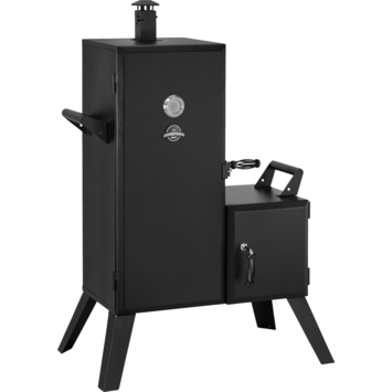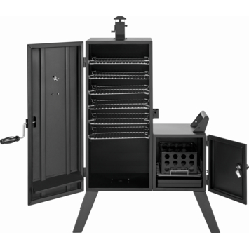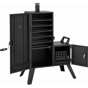 Met de Jamestown Finley vertical smoker voeg je eenvoudig rooksmaak toe aan je gerechten. Deze rookbarbecue is geschikt voor langzaam garen van vlees of vis, waarbij rook en warmte zich gelijkmatig verspreiden. Je houdt de temperatuur in de gaten met de ingebouwde thermometer in het deksel. Het grillrooster heeft een diameter van 26,5 cm, voldoende voor meerdere stukken tegelijk. Dankzij de verticale vorm rook je efficiënt op meerdere niveaus. De smoker is gemaakt van metaal en uitgevoerd in zwart. Je gebruikt hem op het terras of in de tuin voor een avond roken en grillen met familie of vrienden.