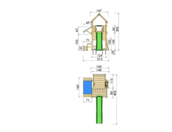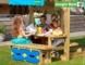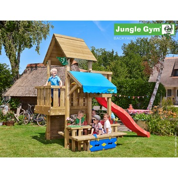 Een klassiek speelhuis met een twist. Tijdloos houten dak, twee platformen, stuurwiel, klimmuur met kleurrijke klimstenen, lange glijbaan met optionele wateraansluiting, picknicktafel en zandbak. Tip: Jungle Cubby is ook nog verkrijgbaar met andere uitbreidingen zoals een trein, schommel, ...